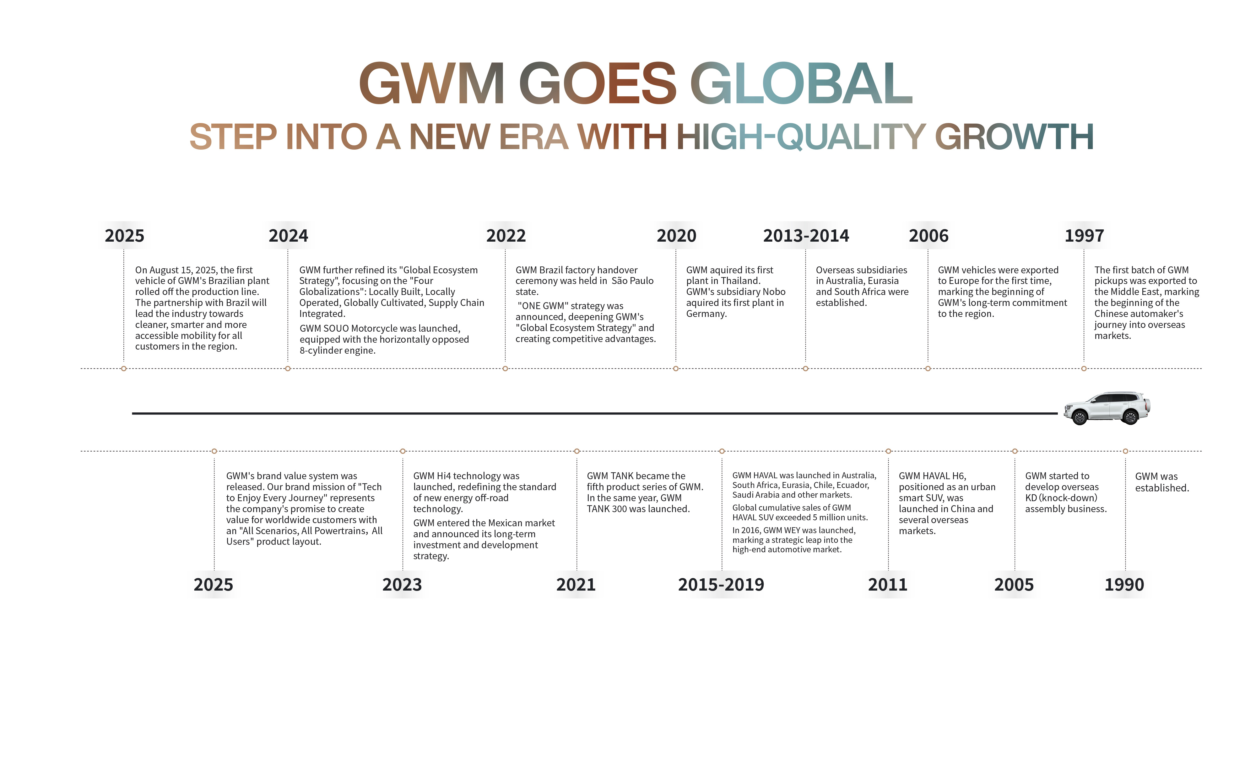 • All Scenarios: GWM develops vehicles for all scenarios — from sedans and pickups to SUVs, heavy-duty trucks, motorcycles, and RVs — all led by a passion for exploration.